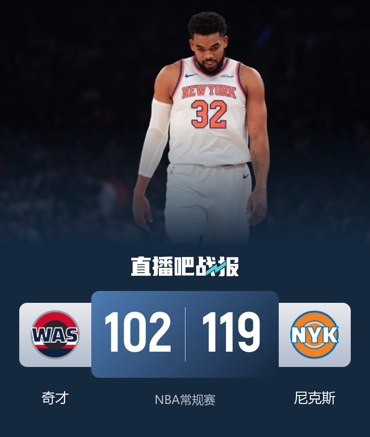 比赛上来,两队打得十分胶着,场上比分交替领先,首节后半段反而是奇才打出小高潮获得优势,次节奇才命中率下滑明显,替补出场的克拉克森单节得分上双帮助尼克斯完成反超,半场结束时奇才落后3分;下半场回来,尼克斯突然发力,利用一波17-0的攻势直接将分差扩大到二十分以上,比赛在末节已经失去悬念,最终尼克斯轻取奇才,送给后者五连败。