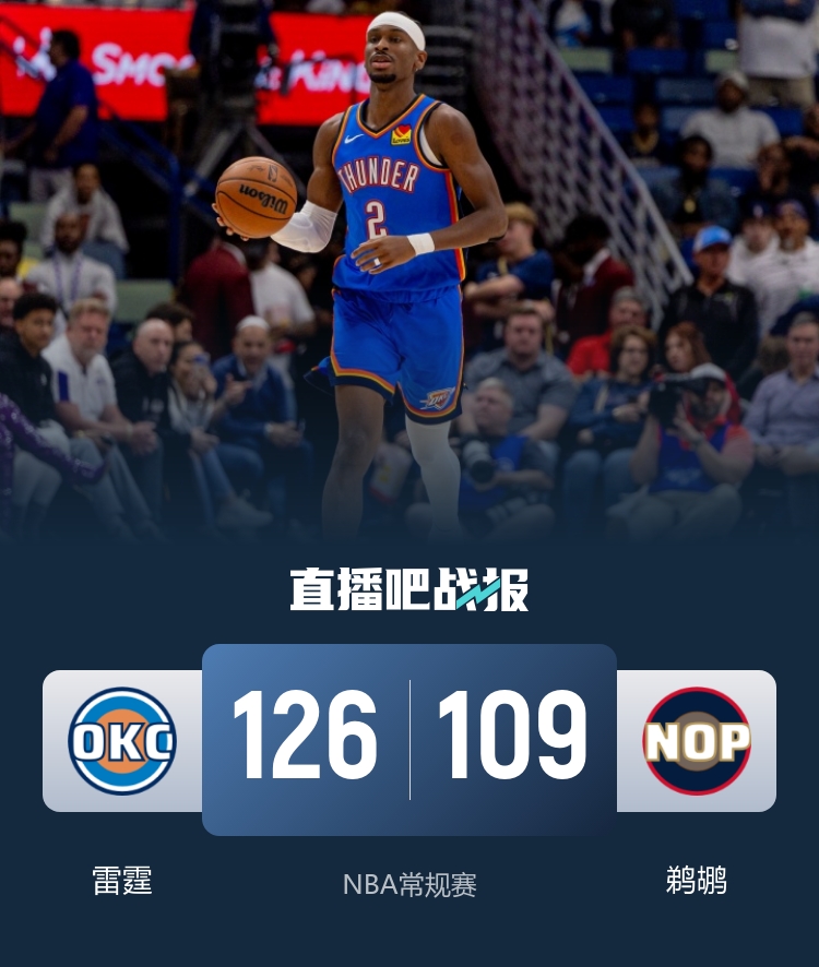 此役一上来雷霆反客为主迅速占优,亚历山大连造杀伤,切特连投带罚续上火力,多特手感滚烫飚中4记三分,三人联手率队率队单节狂轰49分,首节结束时雷霆确立25分优势,次节回来,雷霆进攻火力放缓,墨菲联手费尔斯率队追分,半场战罢,雷霆依然领先13分。易边再战后雷霆找回进攻节奏,亚历山大率队多点开花牢牢占优,三节结束后雷霆再度领先25分,末节上来,亚历山大早早休战,鹈鹕进攻乏力追分无望,比赛提前进入练兵时间,最终雷霆126-109大胜对手迎来6连胜,同时送给鹈鹕6连败。
